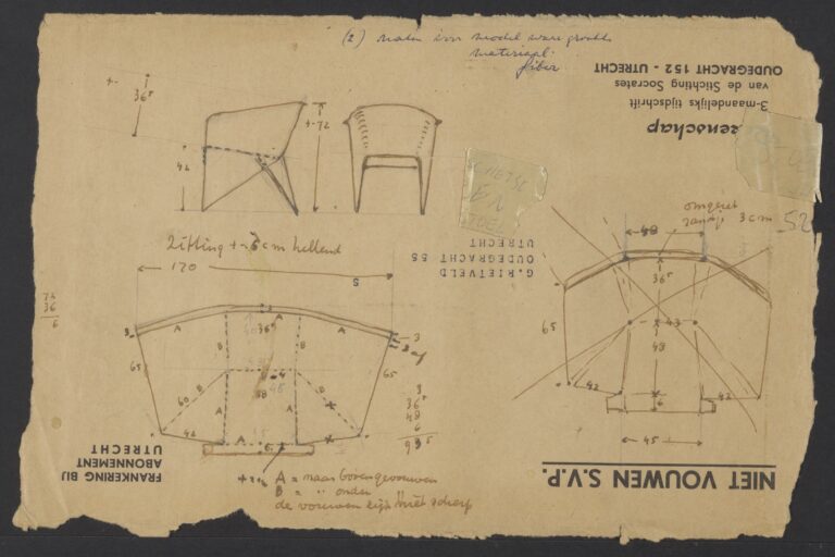 A spectacular discovery made by the researchers during their investigation in the archives of Het Nieuwe Instituut in Rotterdam is a previously unpublished drawing Rietveld made on an old envelope addressed to him in the 1950s. It’s a designsketch/drawing for a high model chair, to be folded from a singel sheet of material, which matches the design of our Aluminum Side/Table Chair and the one of Centraal Museum Utrecht. It depicts a front- and sideview, alongside with two drawings with dimensions and instructions for how to fold the chair from a single sheet of material. Like in other drawings in which Rietveld sketched the models of the Aluminum Chair, “fiber” is again mentioned as the material to be used.