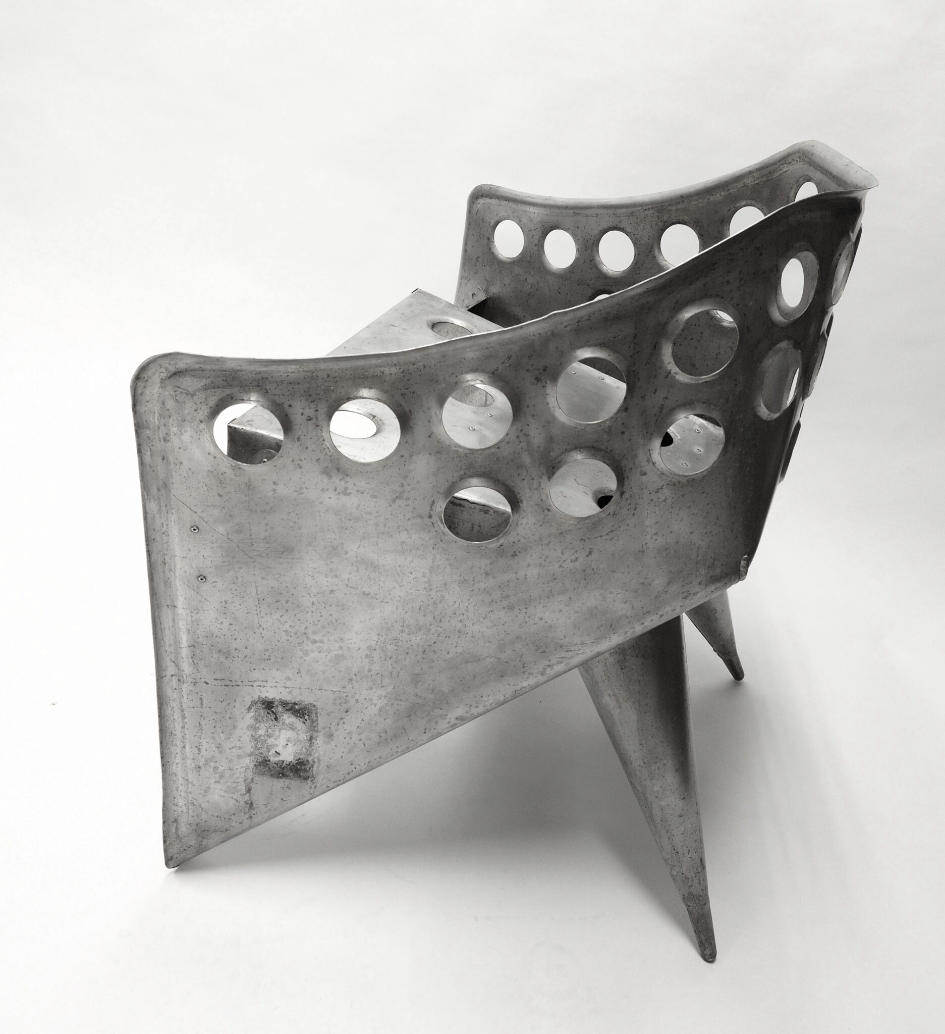 Side/Table Chair, folded and bent out of a single sheet of aluminum, assembled using blind-rivets and welding. Dimensions: 77 x 79 x 61 cm/24 x 30,3 x 31,1 In