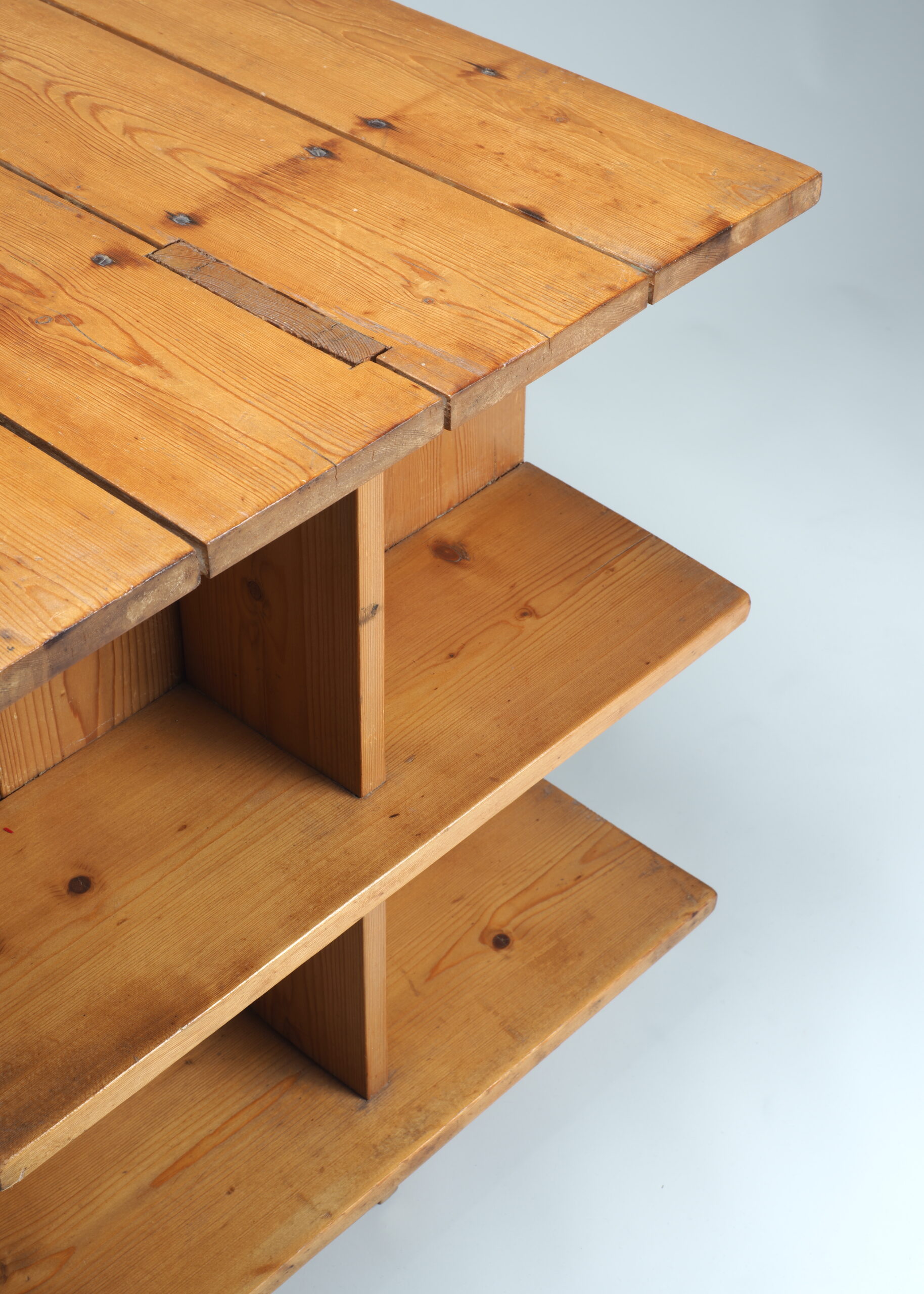 Solid pine planks mounted with wood joints and iron screws.