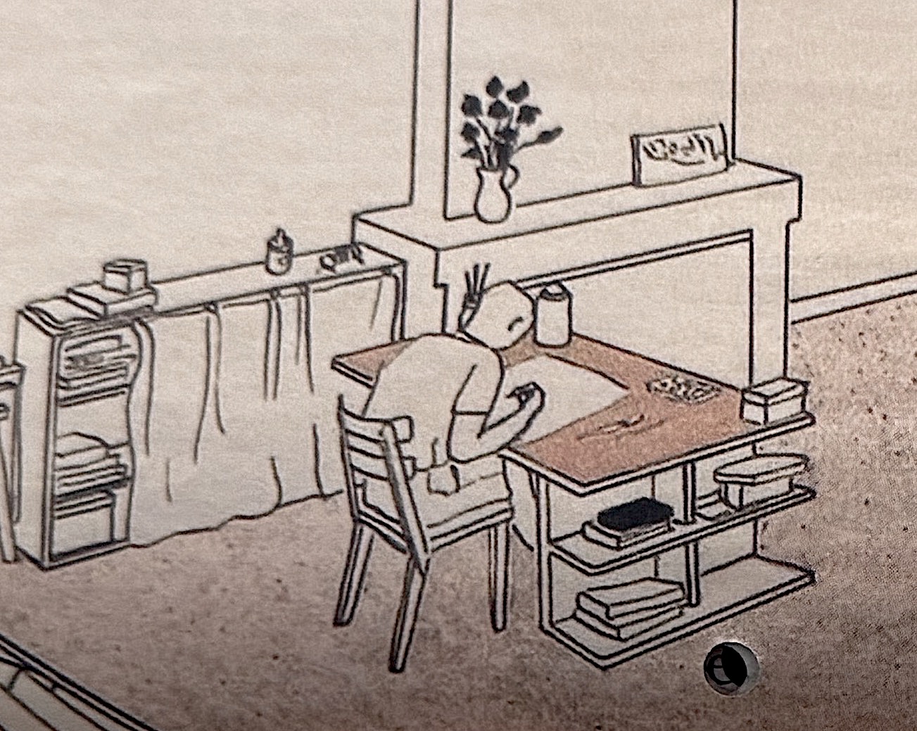 Benno Premsela, late 1930s, fragment of a larger drawing, depicting Jettie Olivier at the ‘Crate-Desk’, in the living room of the apartment where she and Otto Treumann lived, on the Vossiusstraat in Amsterdam. Family archive B. treumann.