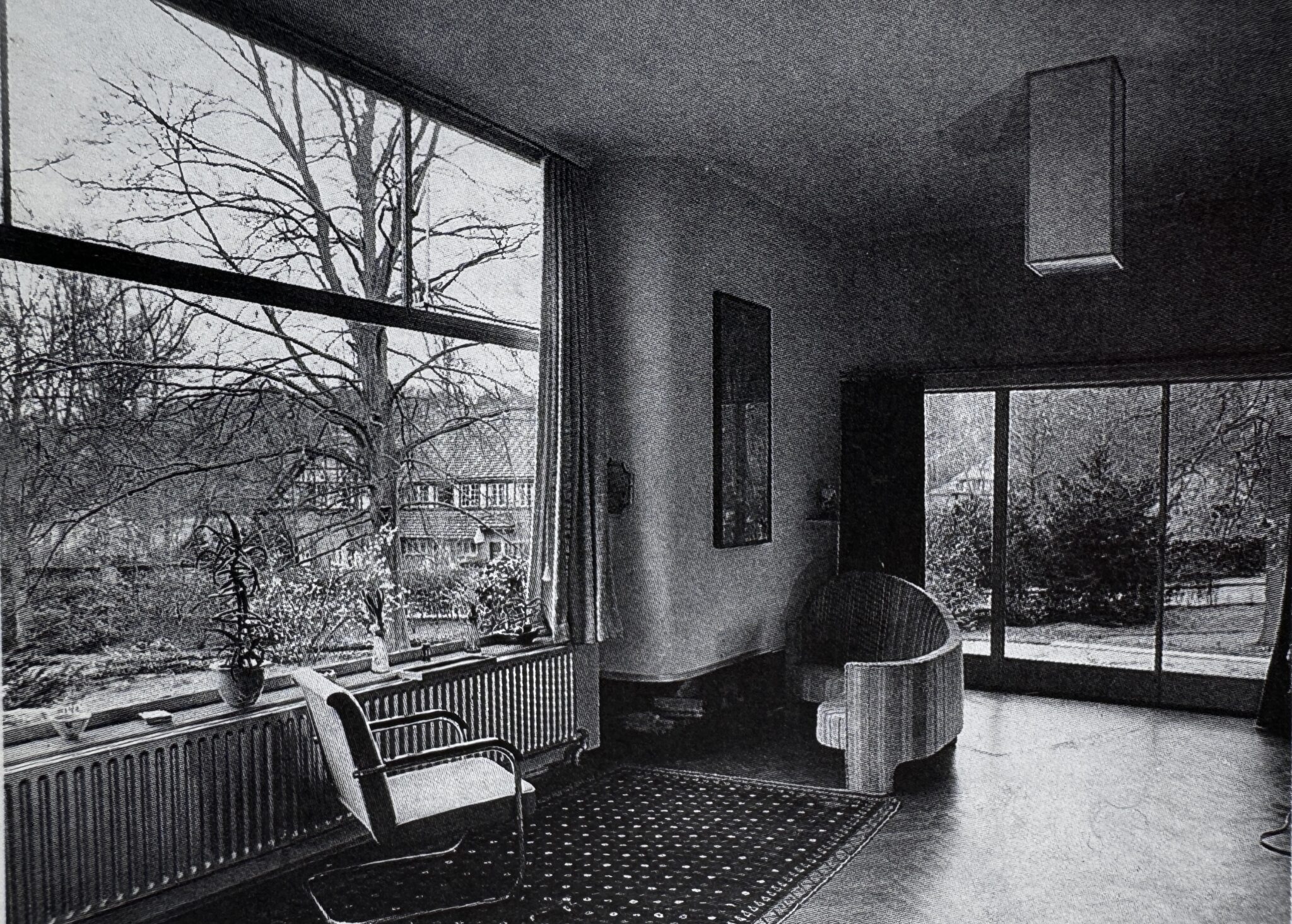 Over several decades, the Dutch feminist, patron and art collector Ada Helena Hondius-Crone (1893 – 1996) commissioned progressive designers and architects for renovations and interior design projects. Around 1935, Gerrit Rietveld received the commission to renovate one of her houses, a villa in the village of Bloemendaal, named ‘Vijverhof’. Küper and Van Zijl, p. 164: “The renovation included a library, living room, entrance hall, and studio. Several of Rietveld’s designs were also installed in the house, such as a glass tube lamp on the ceiling.”