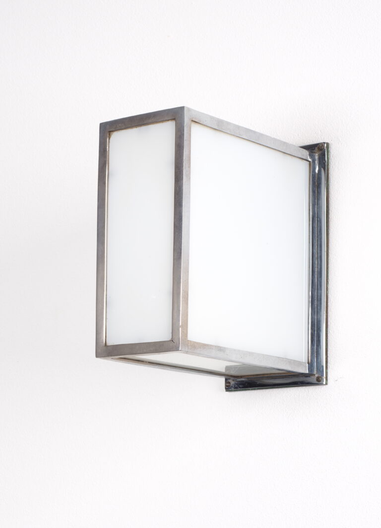 Chrome-plated brass frame holding five opal glass plates mounted on a brass base with electric fitting.