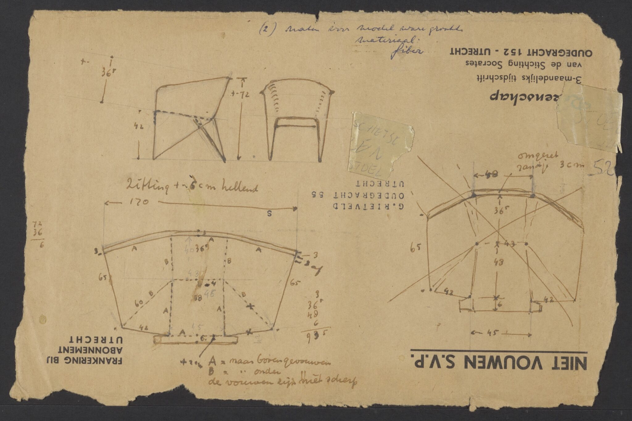 Door de adressering en afzender van de enveloppe is dit de enige tekening van Rietveld’ s vouw-meubelen die met zekerheid te dateren is. Daardoor zijn wij nu in staat om onze Hoge Aluminium Stoel en die van het Centraal Museum, te dateren op de periode 1951-1964.