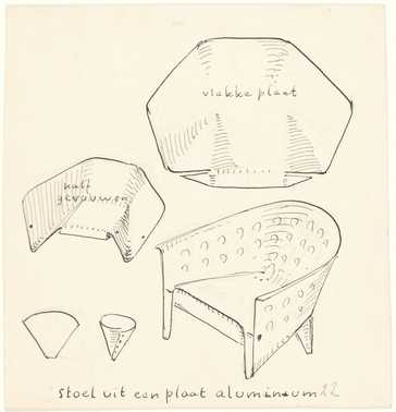 “Het hier afgebeelde model van de aluminium stoel is een naoorlogse productie. Het is een hoog model dat Rietveld schetste op de achterkant van een oude envelop, waarop ironisch genoeg de woorden “Niet vouwen” staan. Een notitie vermeldt dat de stoel van fiber moet worden gemaakt. In een tekening van een serie meubels die van rotan gemaakt zouden worden, is dezelfde stoel zowel in een hoge als een lage versie afgebeeld. Deze aluminium stoel en het archiefmateriaal tonen aan dat Rietveld verschillende materialen geschikt achtte voor de uitvoering van zijn ontwerp. Voor het eerste model koos hij bewust voor aluminium, omdat hij dit materiaal relatief gemakkelijk zelf kon bewerken.”