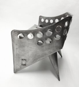 Dit is een van twee identieke bijzet-/tafelstoelen, gevouwen en gebogen uit een aluminium plaat, gemonteerd met behulp van blindklinknagels en lassen. 77 x 79 x 61 cm.