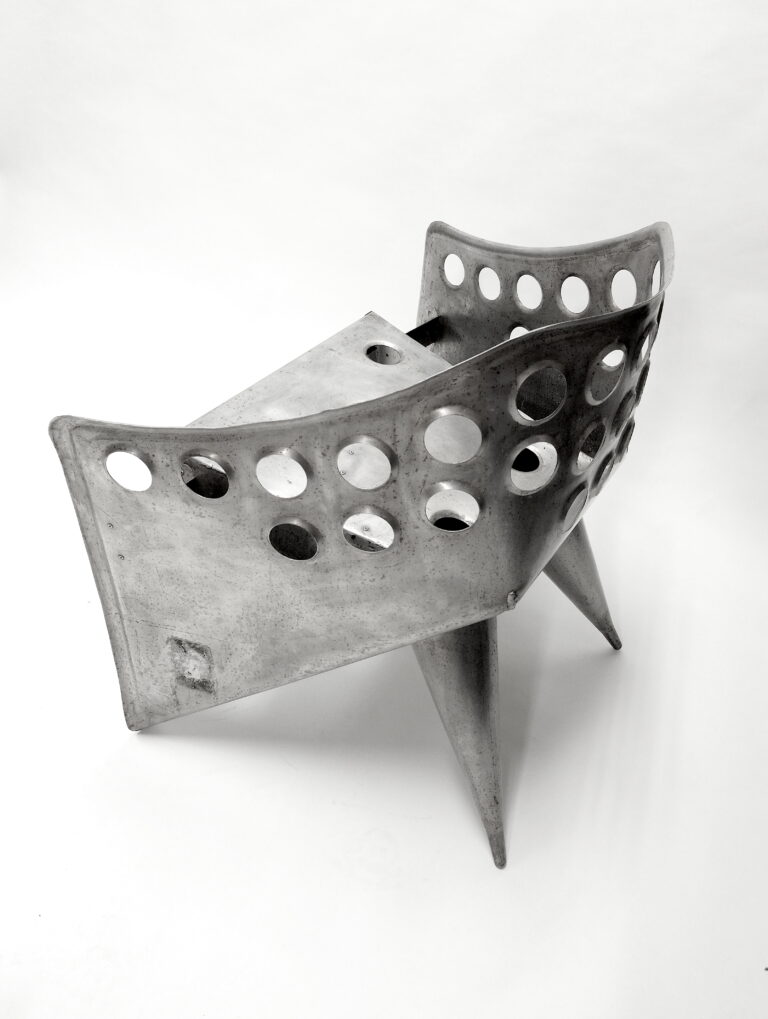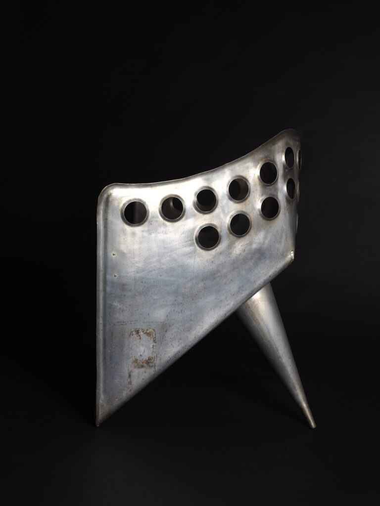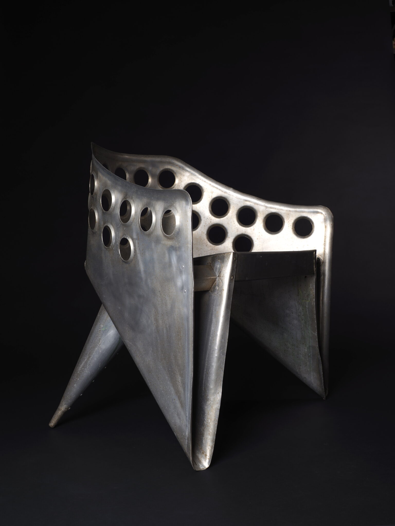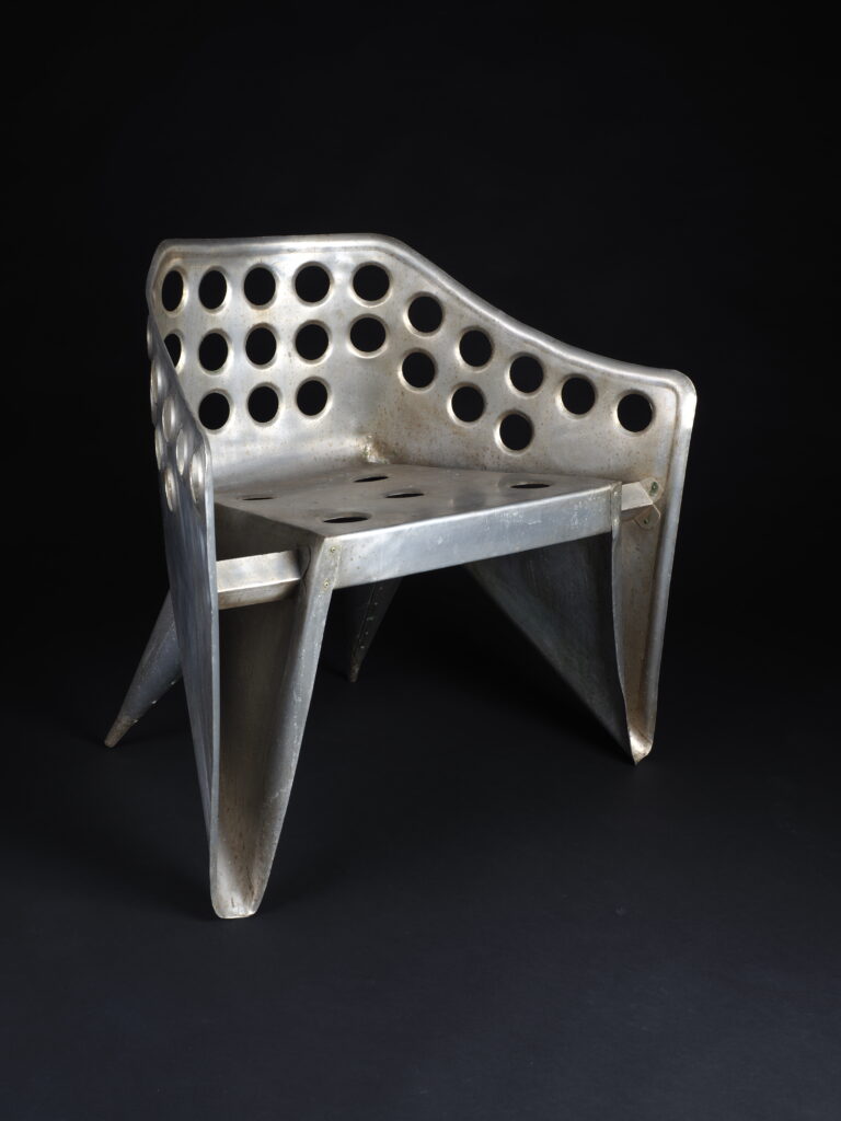 Het topstuk van onze collectie verzamel-waardige en museale designobjecten is deze extreem zeldzame, futuristisch ogende, uit een plaat aluminium gevouwen en gebogen bijzet/tafelstoel, ontworpen door Gerrit Th. Rietveld in de jaren 50.